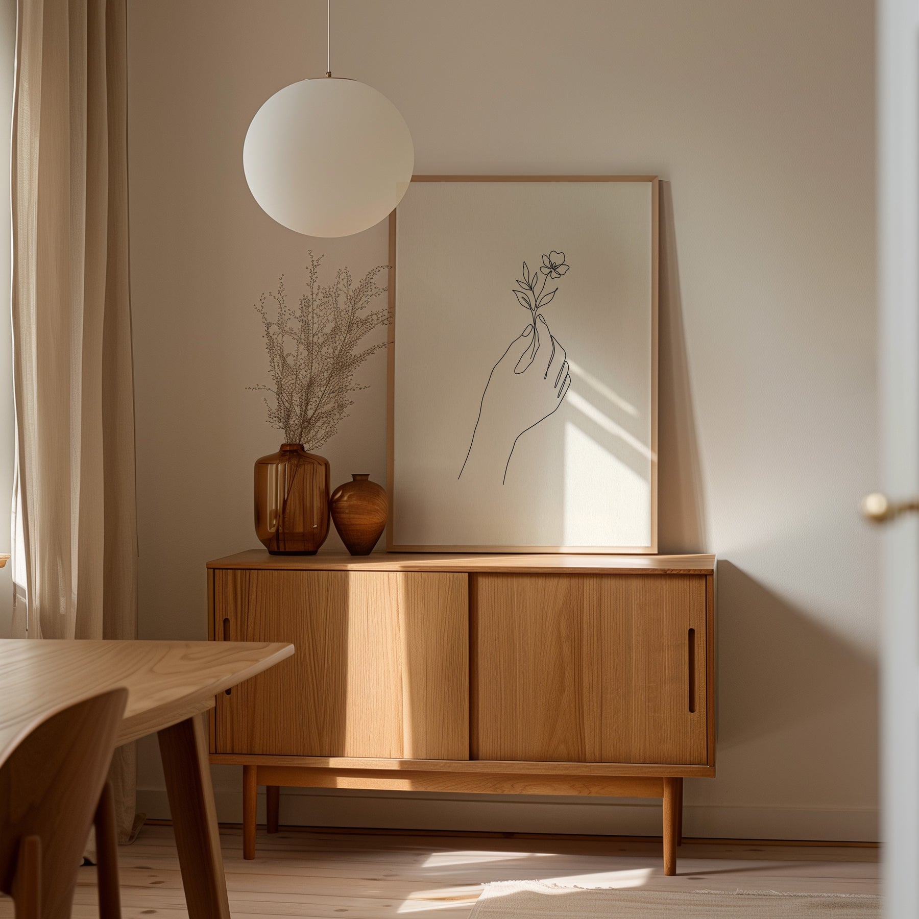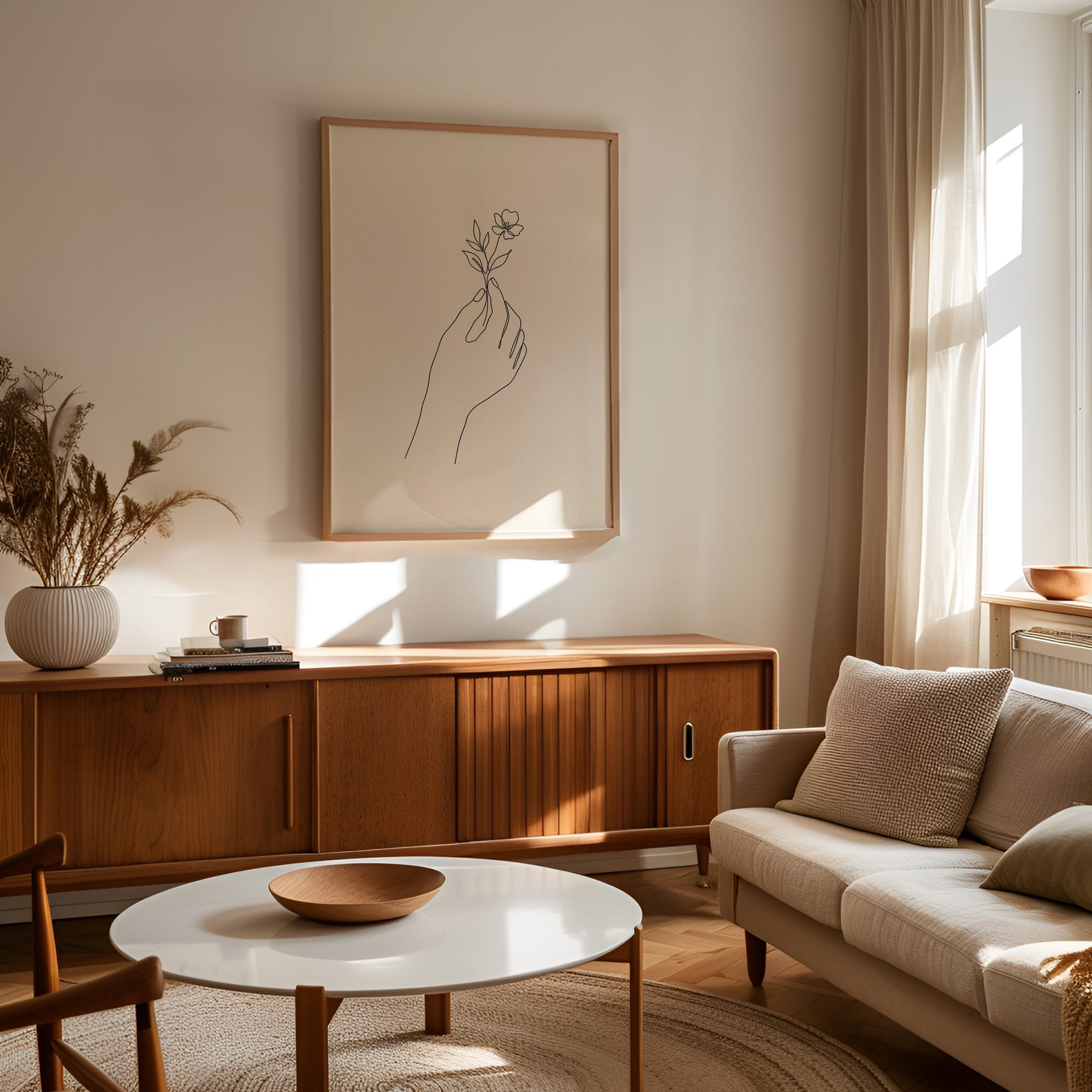 En hand som varsamt håller en blomma – en symbol för närvaro och ömhet. Motivet förmedlar lugn, balans och stillsam skönhet. Passar perfekt i rum där du vill skapa en mjuk och harmonisk känsla. En poster som påminner om det enkla i det vackra.